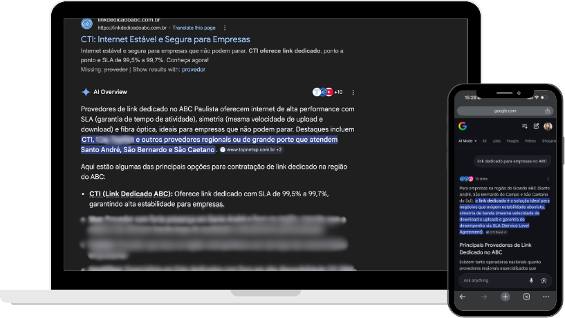 A eficácia da estratégia foi comprovada quando a IA do Google passou a recomendar a CTI para buscas de alta intenção, como “Link Dedicado no ABC”.